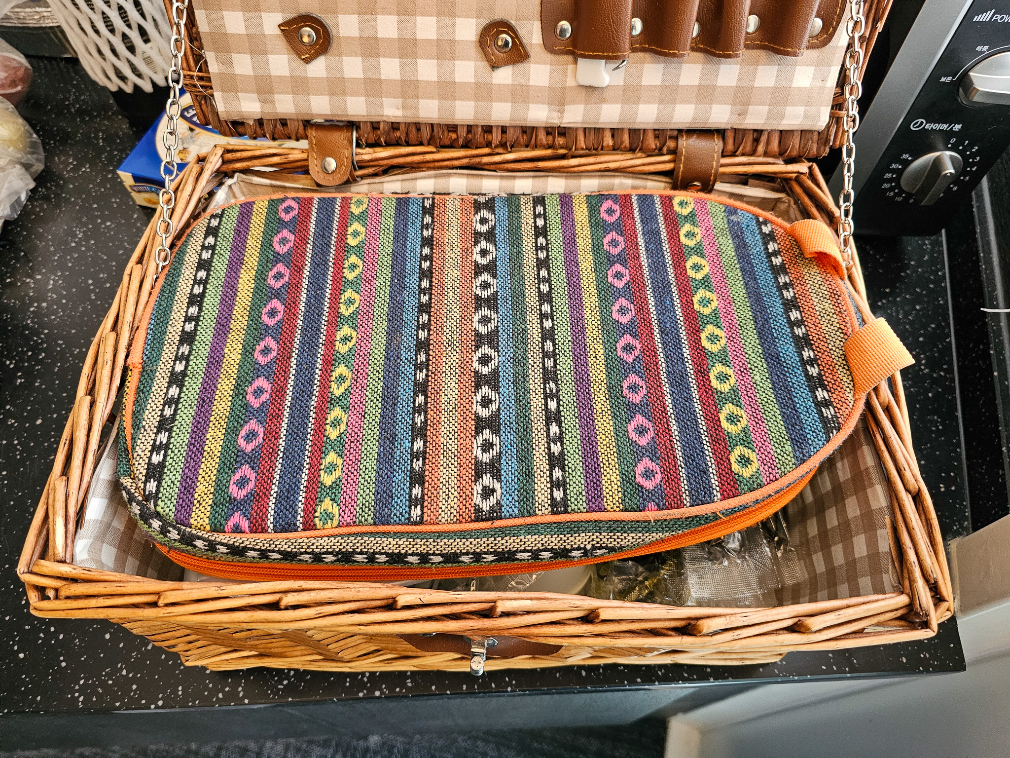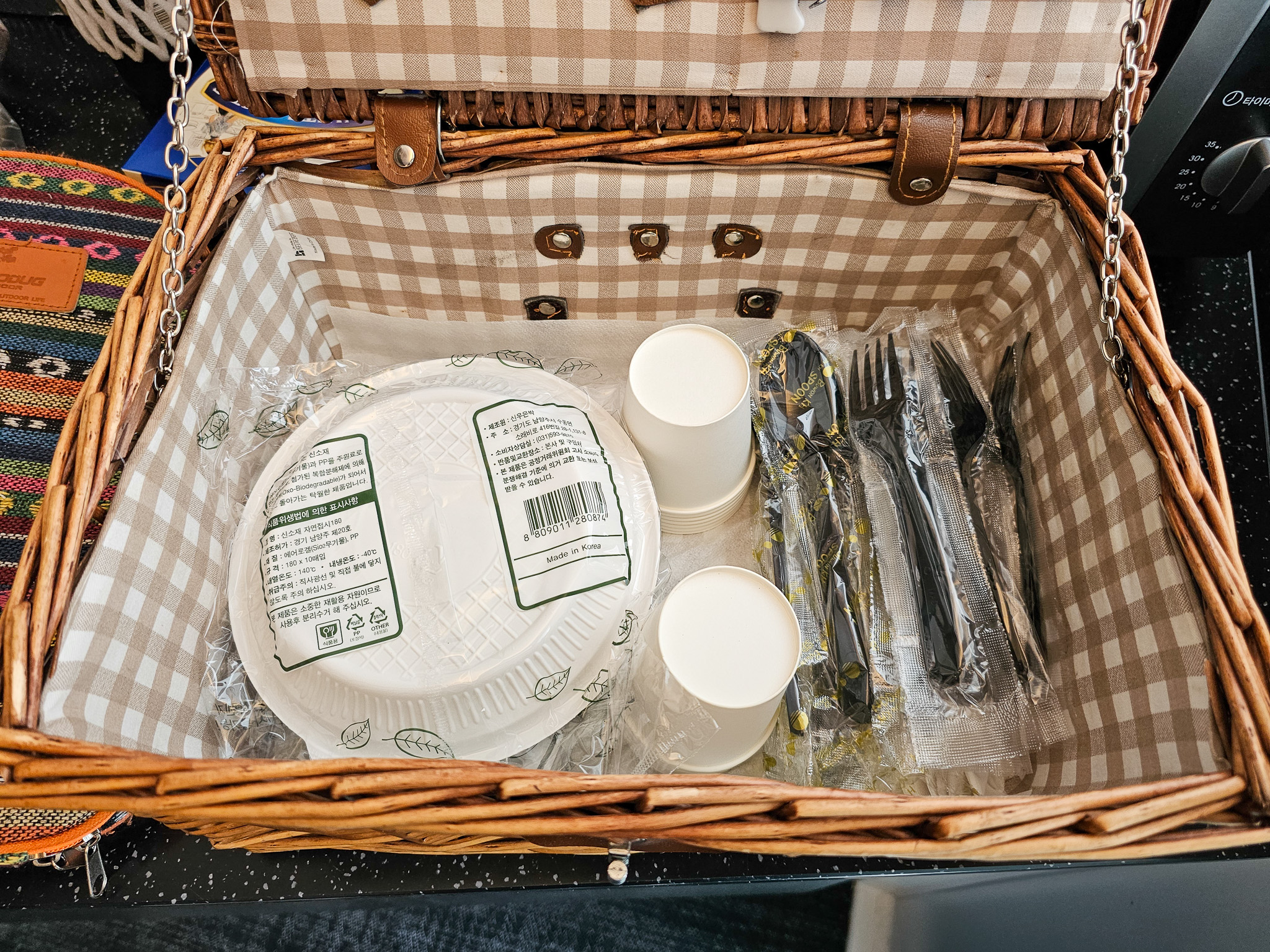 객실 내에 있는 주방에 있는 바구니에 바비큐에 필요한 집게, 가위, 와인오프너, 종이컵, 접시, 숟가락, 포크, 젓가락 등이 담겨 있습니다. 이런 것들을 따로 준비해 갈 필요가 없어서 좋았습니다.