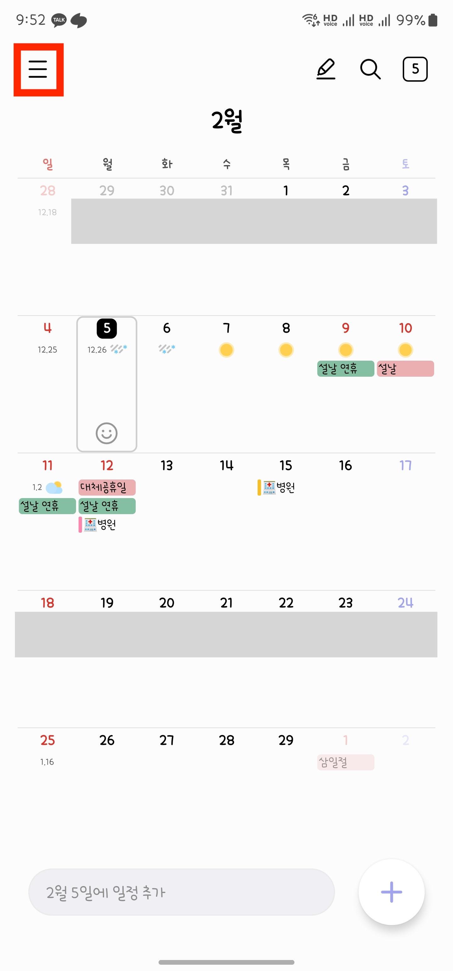 1) 캘린더 앱을 실행하여 왼쪽 상단의 세 줄 버튼을 눌러줍니다.