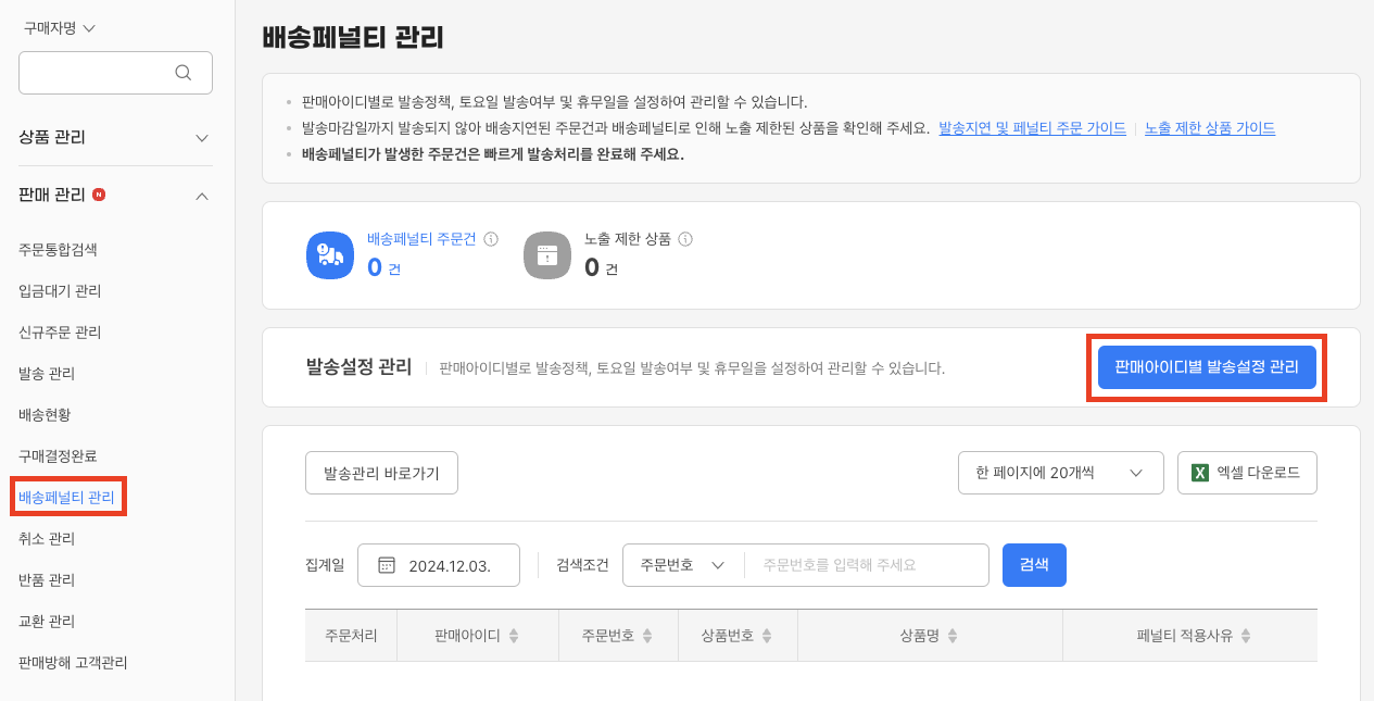 1) 왼쪽 판매 관리 메뉴 > 배송페널티 관리 메뉴를 클릭합니다.
