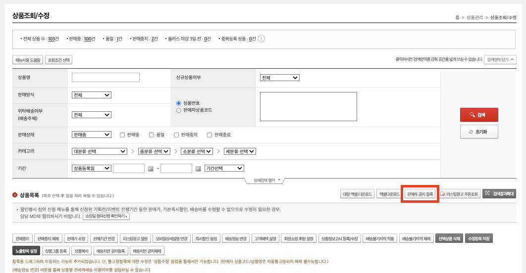 2) 왼쪽 메뉴에서 상품관리 > 공지사항 관리 메뉴에 들어갑니다.