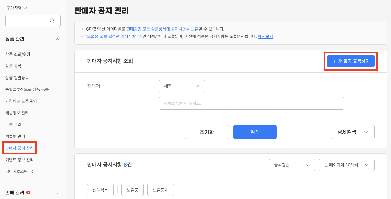 3) 오른쪽 상단의 ‘+새 공지 등록하기’ 버튼을 클릭하고 공지사항을 등록합니다. 이때 G마켓과 옥션에 둘 다 입점해 있는 경우 공지사항을 각각 등록해줘야 합니다.