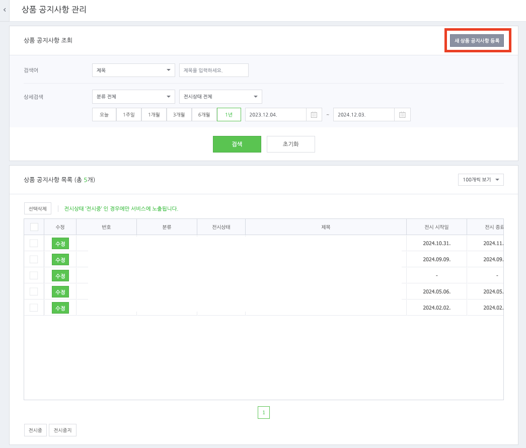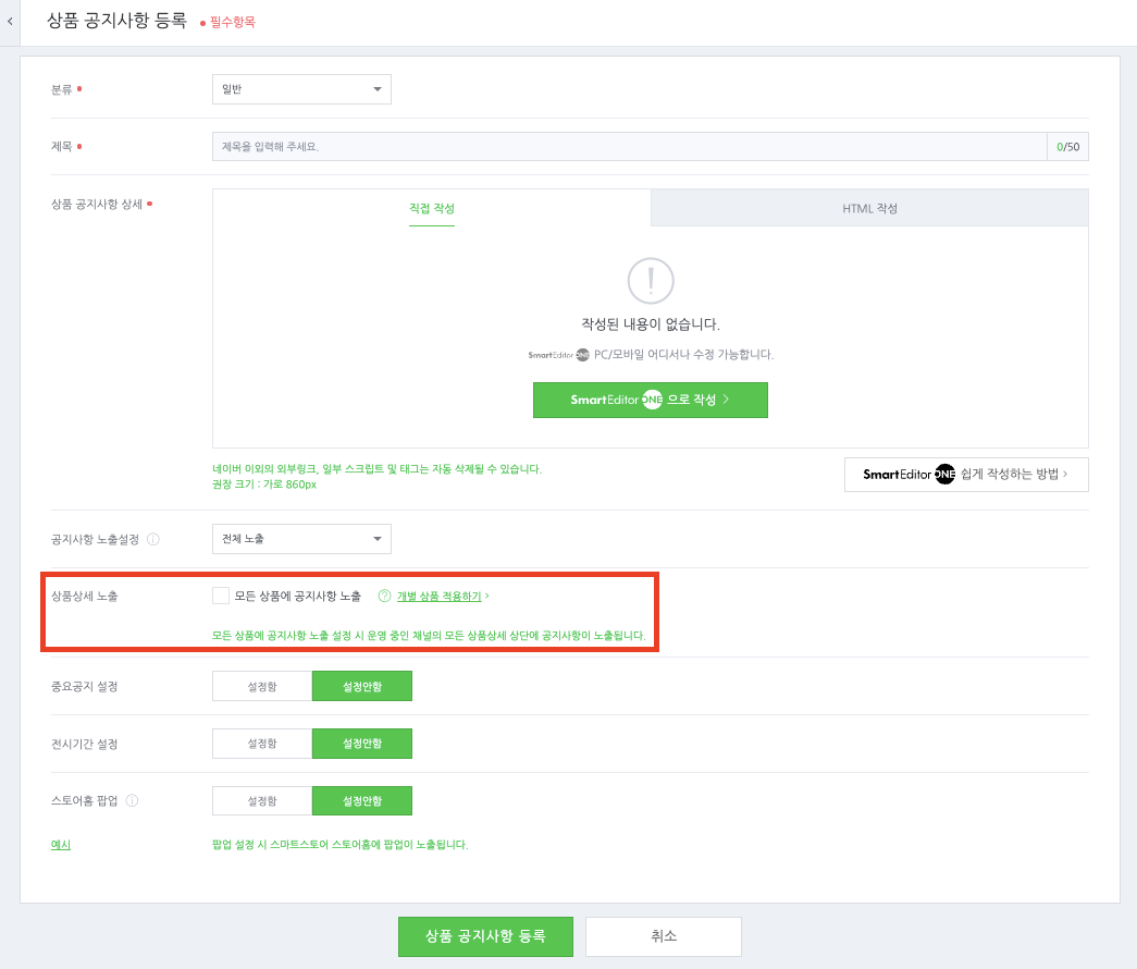 3) 오른쪽 상단의 새 상품 공지사항 등록을 클릭하고 제목과 공지사항 내용 등을 입력합니다. 이때 상품 상세노출에 “모든 상품에 공지사항 노출”을 적용하면 자동으로 내 스토어에 등록된 모든 상품의 상세페이지 상단에 공지사항이 노출됩니다.