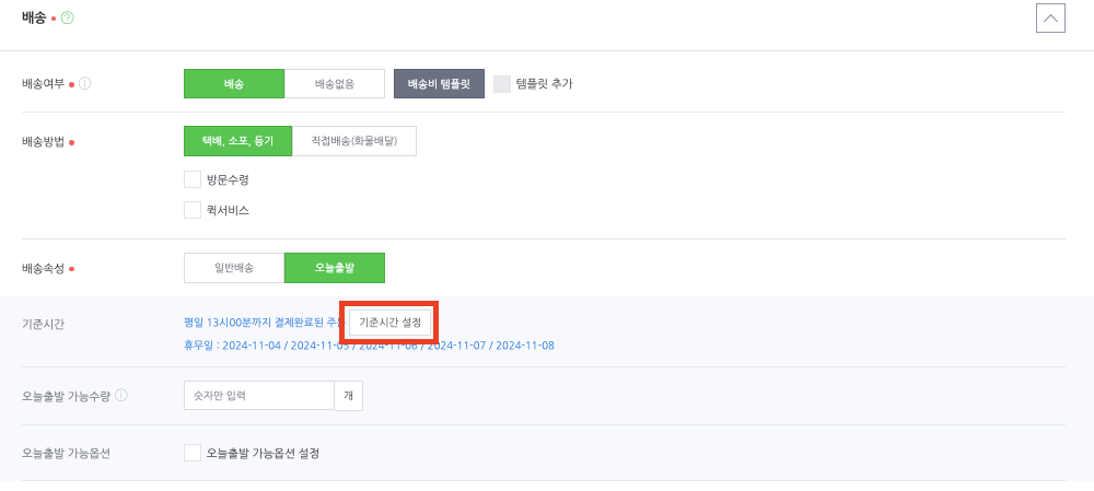 2) 하단의 배송을 설정하는 부분에서 기준시간 설정을 클릭하면 휴무일을 설정할 수 있습니다. 휴무일을 설정하고 저장을 누릅니다.