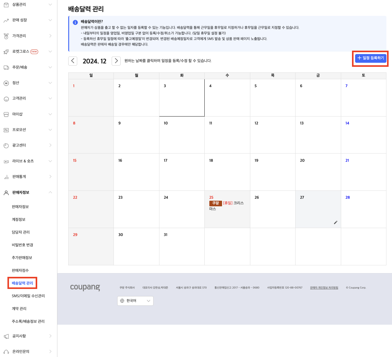 3) 원하는 날짜를 클릭하거나 오른쪽 상단의 ‘+일정 등록하기’ 버튼을 클릭해서 배송 휴무일을 등록합니다.