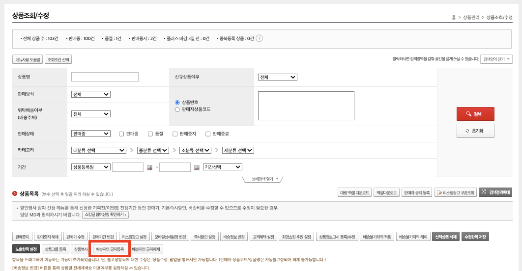 1) 위와 동일한 메뉴에서 상품 하나를 선택하고 중간에 있는 ‘배송지연 공지등록’ 메뉴를 클릭합니다.