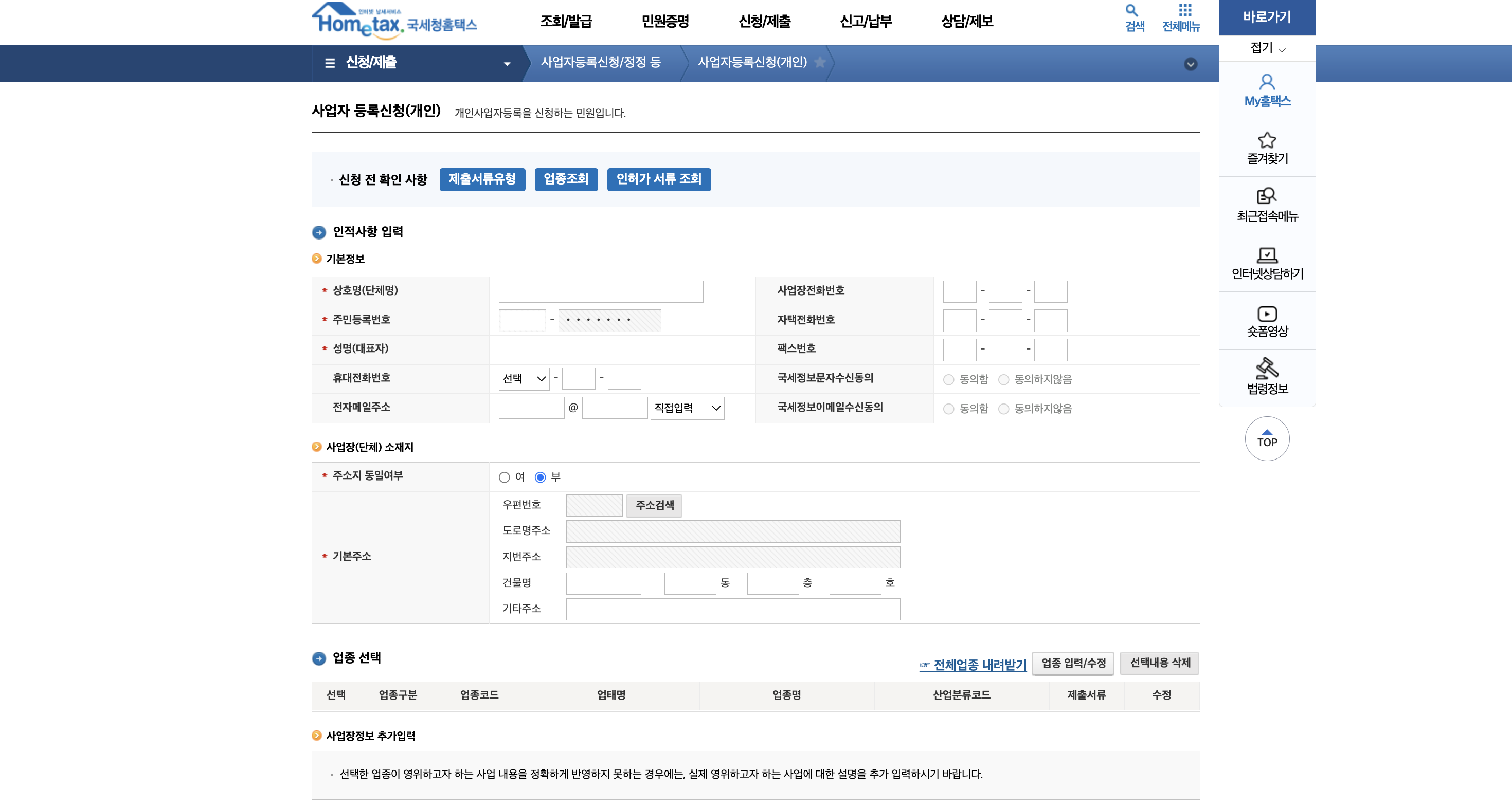2) 신청/제출 메뉴에서 사업자등록신청(개인)으로 접속