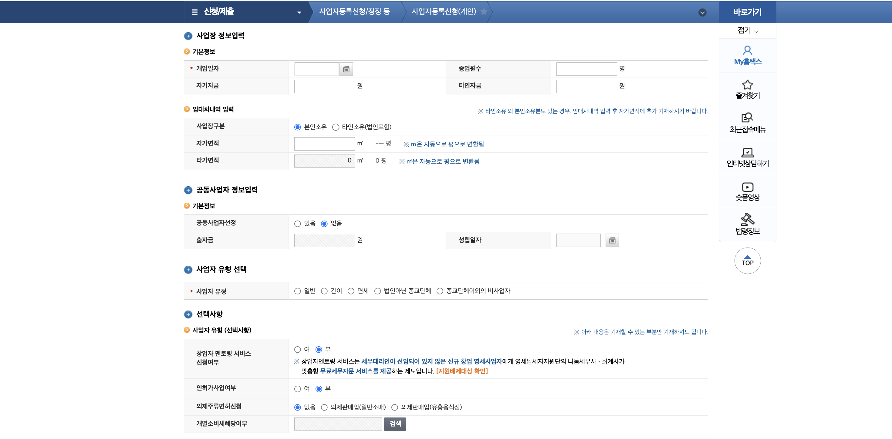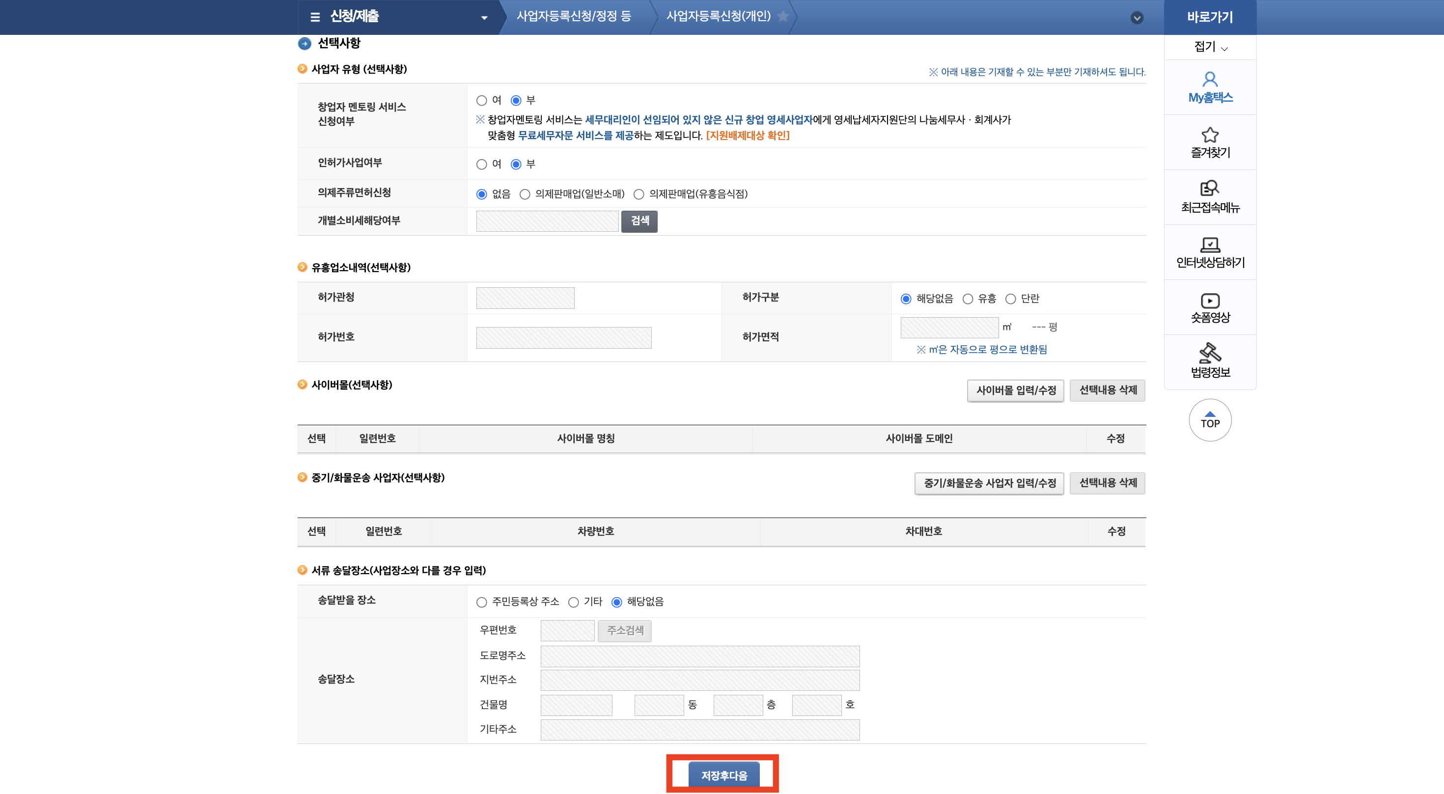 4) 인적사항, 업종선택, 사업장정보, 공동사업자 정보, 사업자 유형, 선택사항 등을 입력하고 저장 후 다음 버튼 클릭