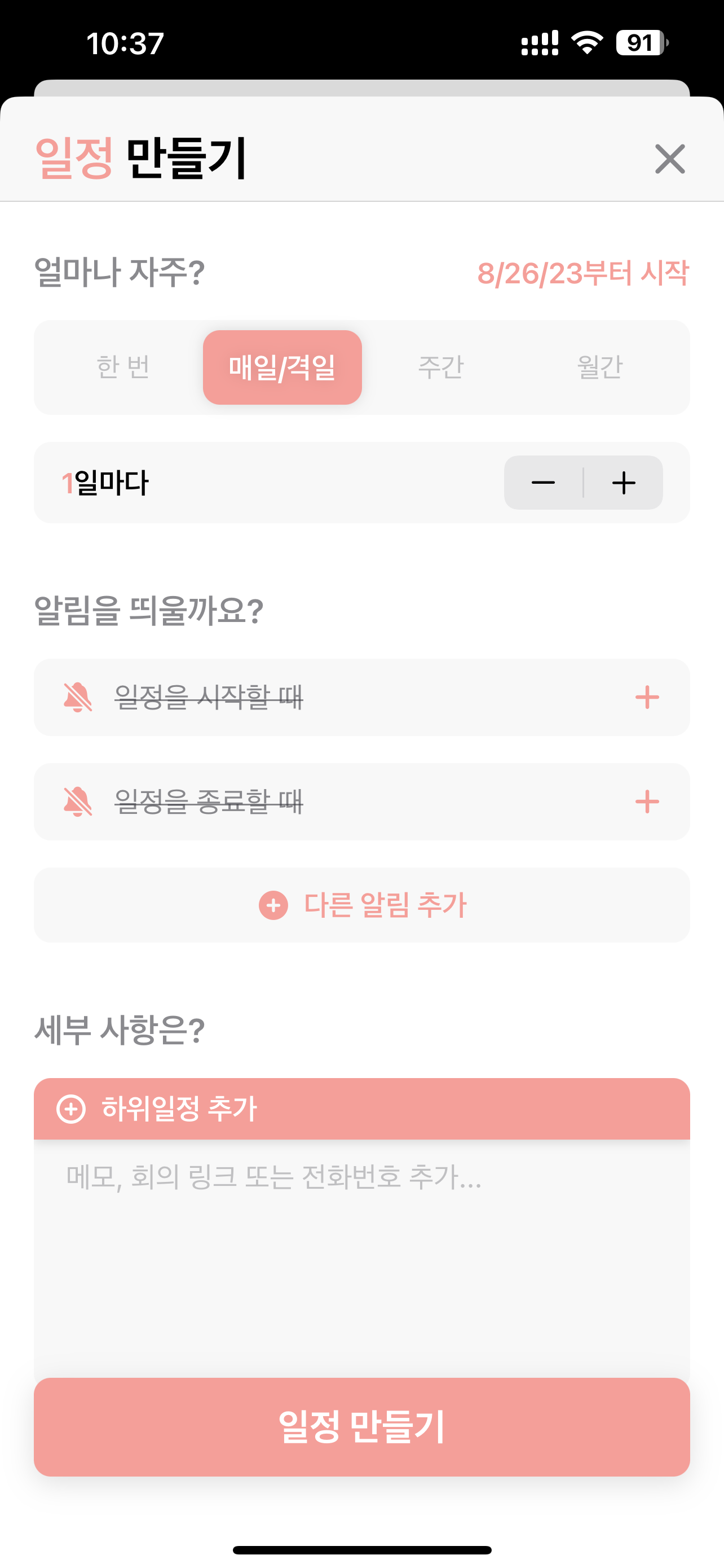 일정별로 시간, 색깔을 설정할 수 있고, 반복, 알림, 하위 일정도 추가 가능합니다.