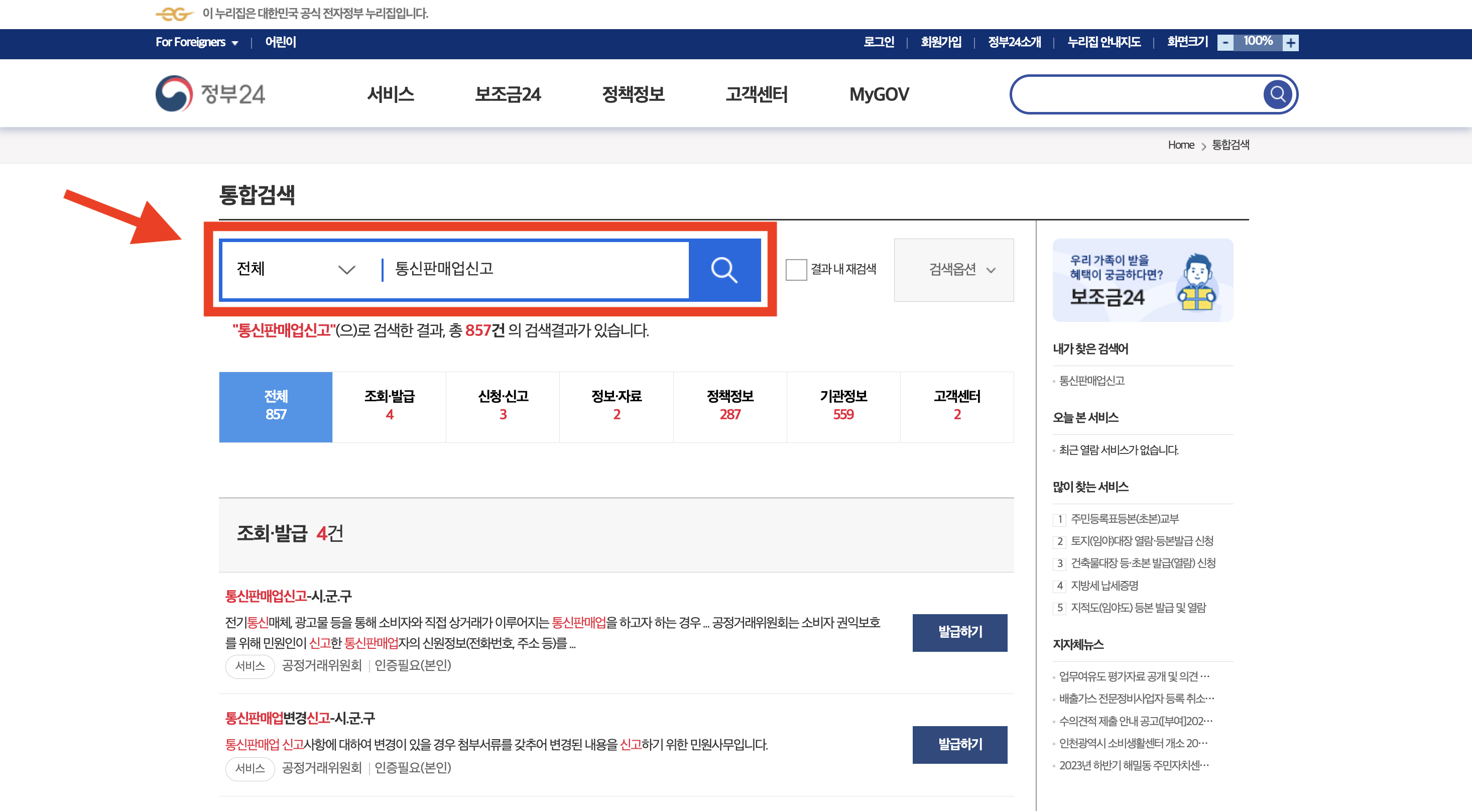 2) 사이트에 접속한 뒤 '통신판매업 신고'를 검색합니다.