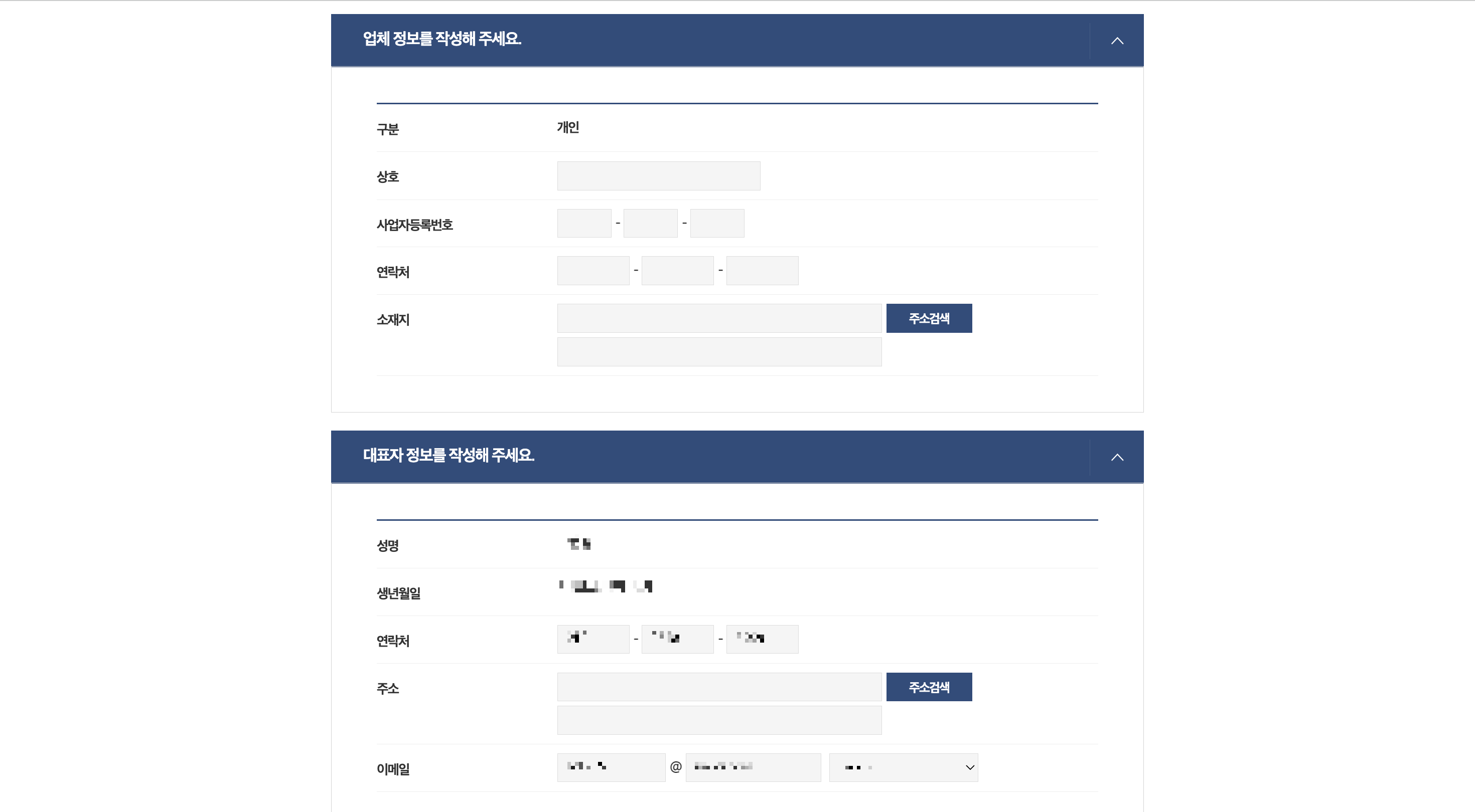 4) 본인의 사업자등록증을 참고해 정보를 작성합니다. 판매방식은 '인터넷'을 가장 많이 선택하고, 취급품목은 '종합몰'로 선택하면 됩니다.