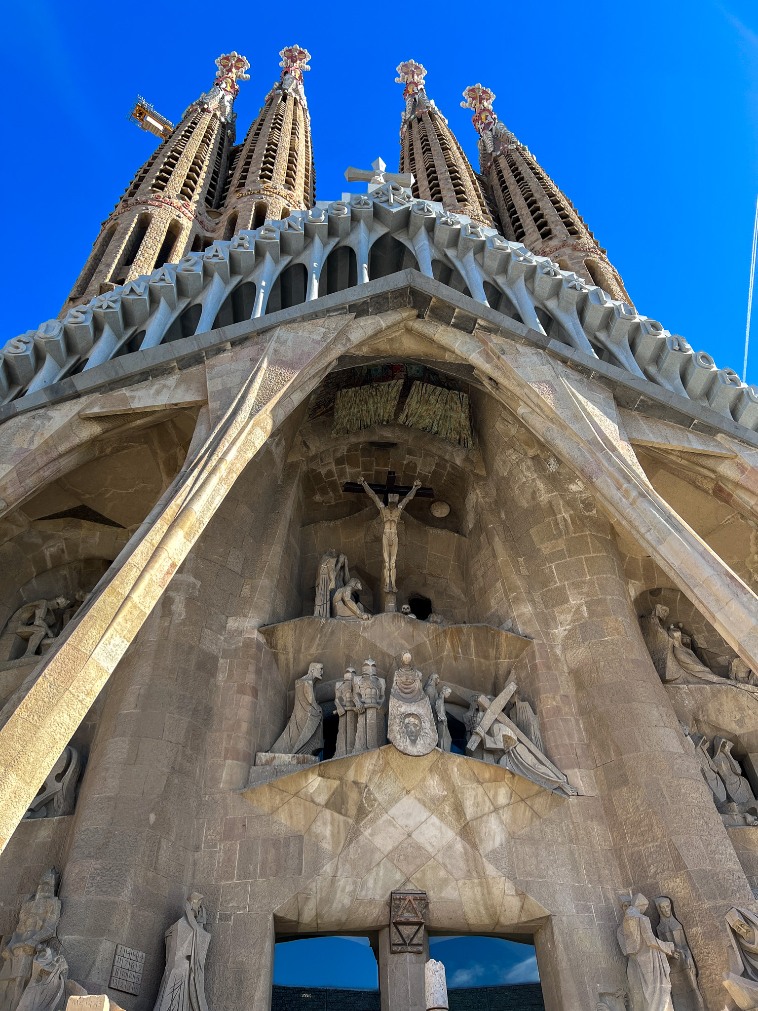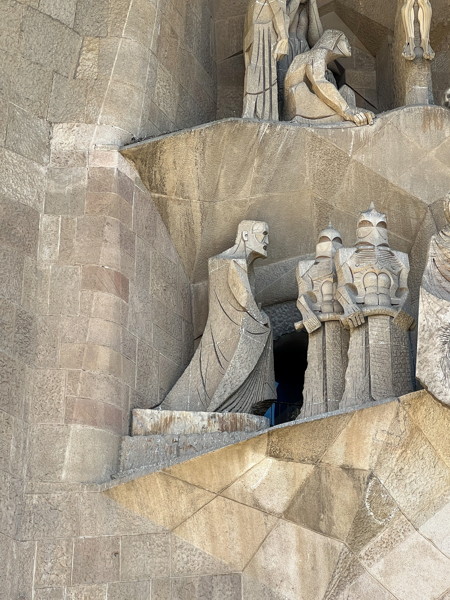 탄생의 파사드 반대편 쪽에는 수난의 파사드가 있습니다. 수난의 파사드는 ‘조셉 마리아 수비라츠’가 건축한 파트입니다. 가우디의 조각들이 굉장히 화려하고 정교했다면, 이곳의 조각들은 직선이 많고 간결합니다. 아무래도 예수의 수난을 이런 대비를 통해 표현하고자 했던 것 같습니다.