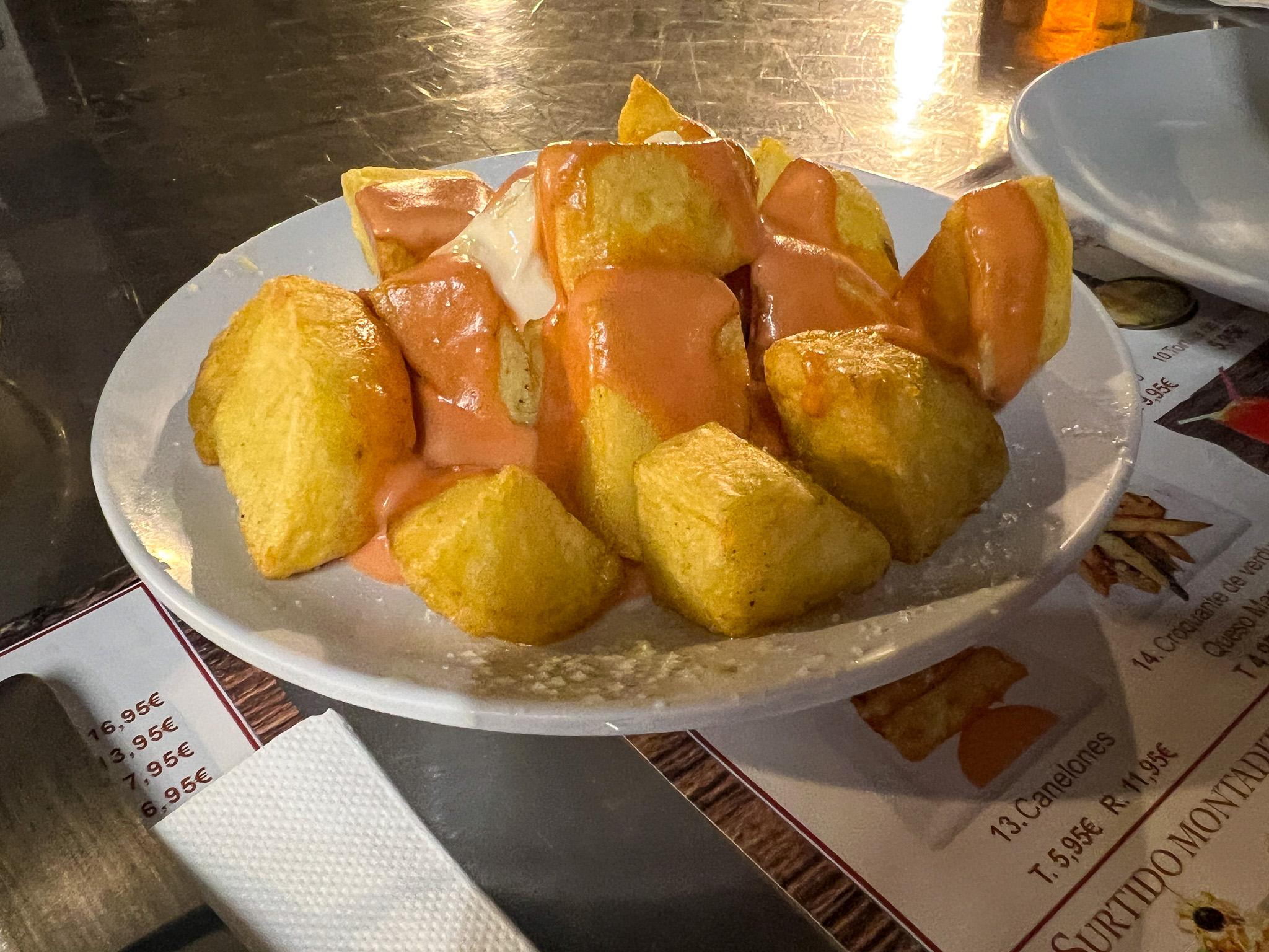 마지막 날에는 판 콘 토마테, 브라바 소스가 곁들여진 감자, 해산물 빠에야, 이베리코 돼지 요리를 먹었습니다. 이베리코 돼지 요리는 약간 속이 덜 익혀져서 나와서 이거 빼고는 다 맛있게 잘 먹었던 식당입니다!