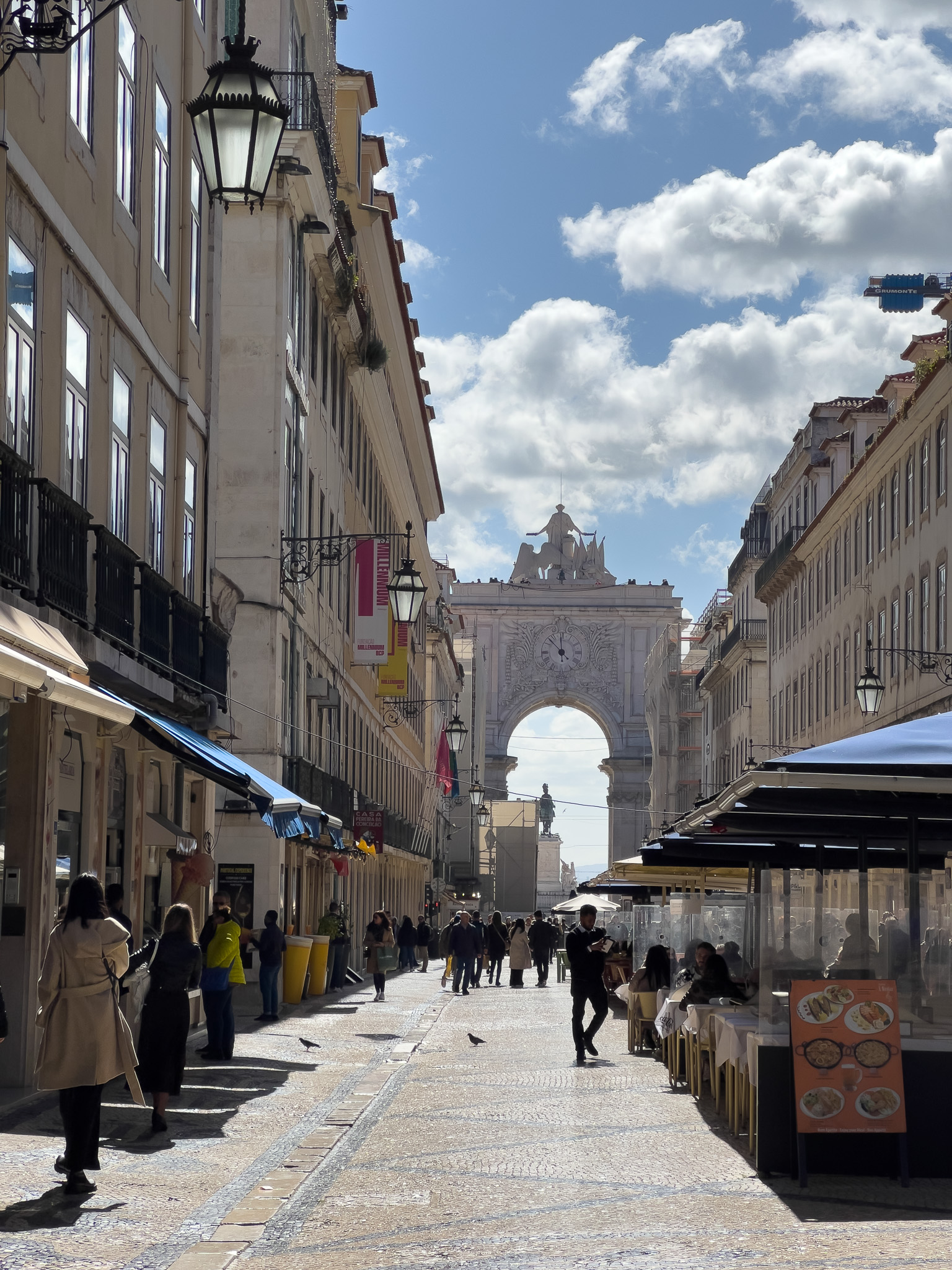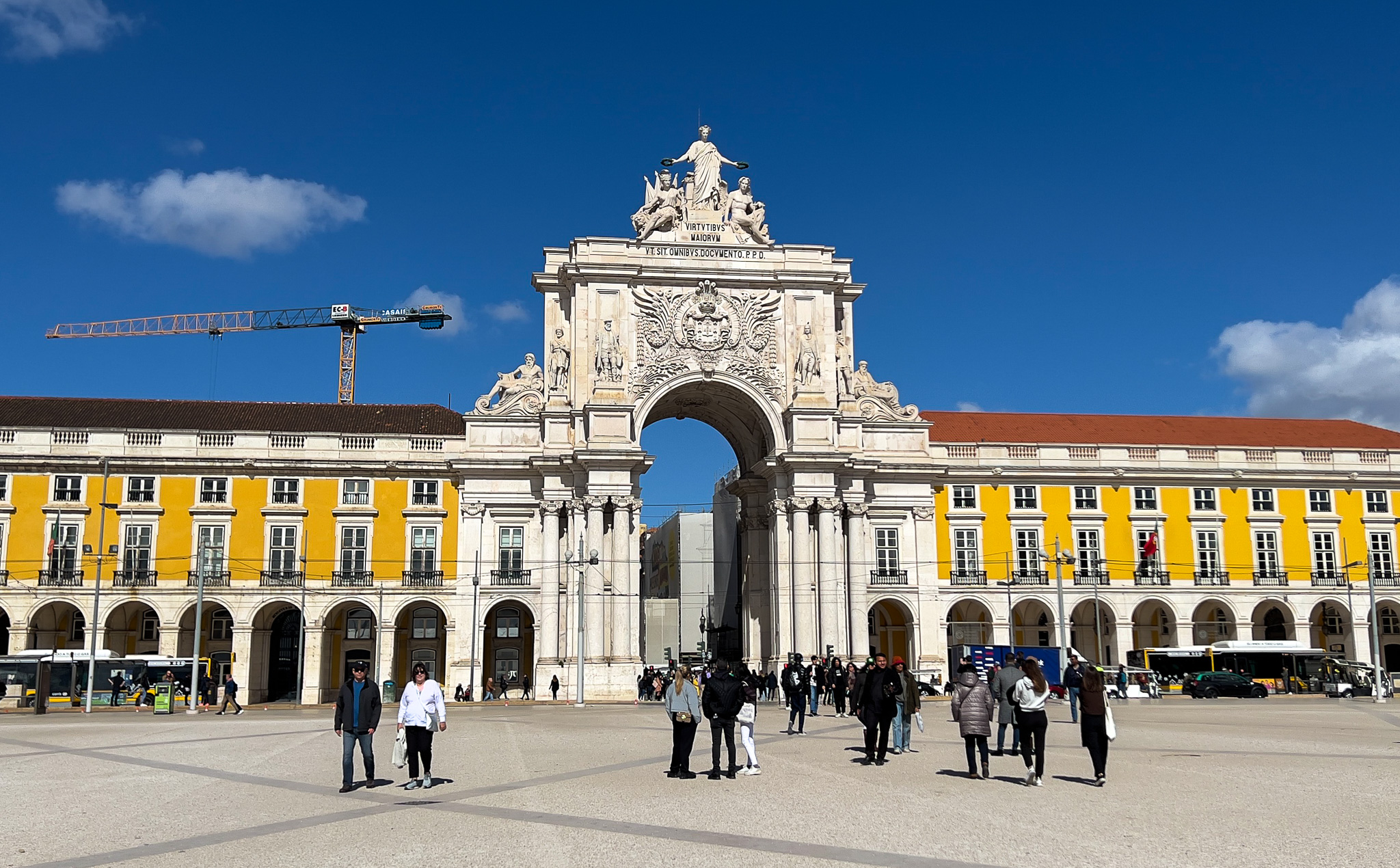 쭉 거리를 따라 걷다 보면 끝에 코메르시우 광장이 나옵니다. 거리 끝쪽에 ‘승리의 아치’라고 불리는 ‘아우구스타 거리 아치’가 있고, 아치를 지나면 광장 가운데 동상이 있습니다. 주변에 노란색으로 칠해진 붉은 지붕의 건물들도 인상적이고, 아치도 웅장해서 멋있었습니다!