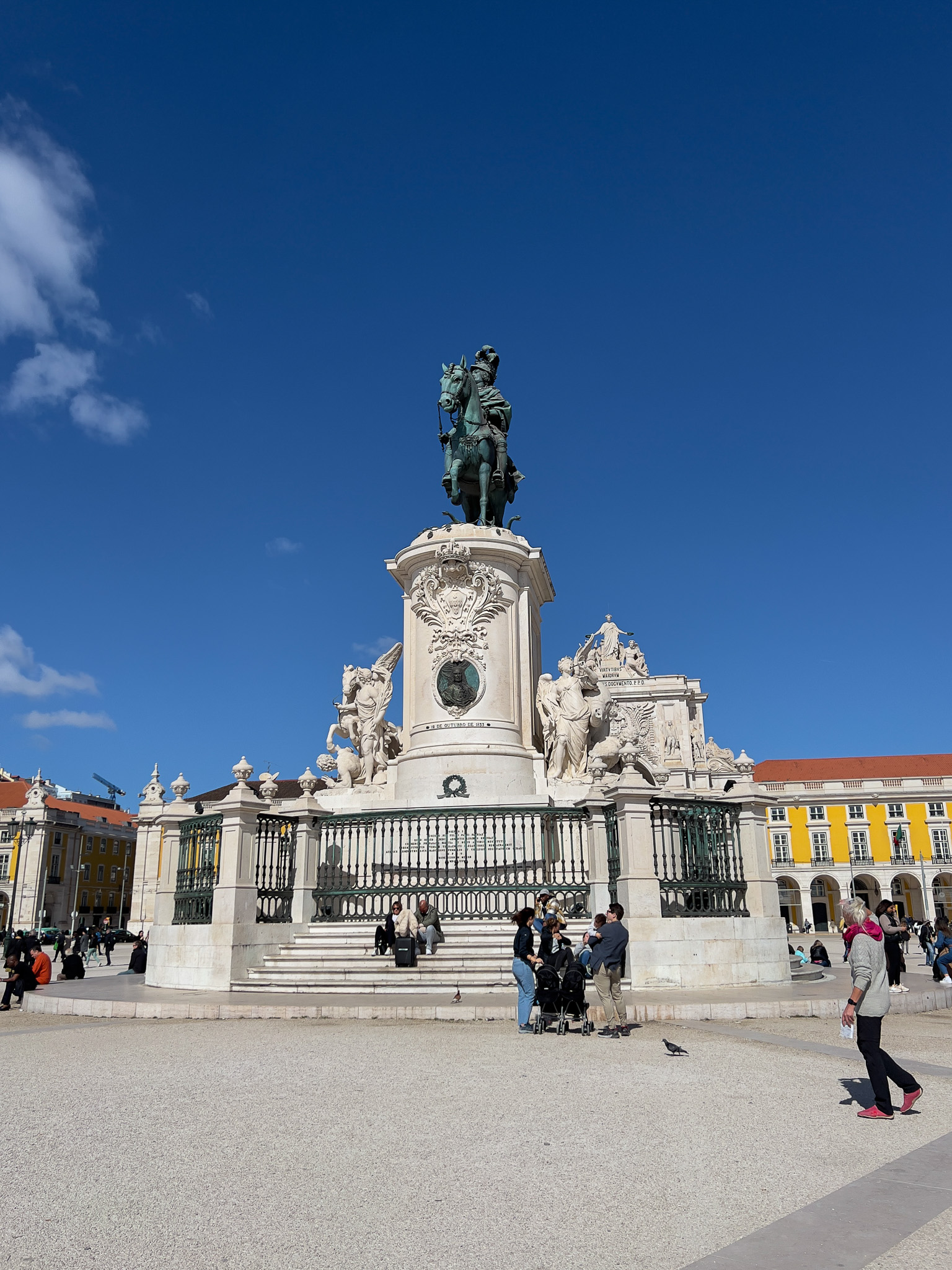 쭉 거리를 따라 걷다 보면 끝에 코메르시우 광장이 나옵니다. 거리 끝쪽에 ‘승리의 아치’라고 불리는 ‘아우구스타 거리 아치’가 있고, 아치를 지나면 광장 가운데 동상이 있습니다. 주변에 노란색으로 칠해진 붉은 지붕의 건물들도 인상적이고, 아치도 웅장해서 멋있었습니다!